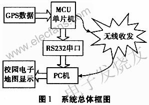校园电子巡更系统主要包括两部分:手持巡更仪部分利用GPS卫星定位模块接收GPS卫星数据,通过单片机提取时间、经度、纬度等有用数据并对得到的有用数据进行存储和控制,而且在出现紧急突发事件的时候,巡更人员能够通过无线收发模块向控制终端发送携带巡更人员地理位置数据的警报信息。控制终端部分主要由控制界面和具体的校园电子地图组成,巡更人员需要把每天的巡更数据通过串口传送给上位PC机,以便重现巡更人员的巡更轨迹。系统总体框图如图1。
