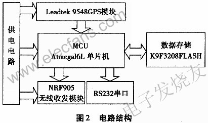 电路主要包括:Atmegal6L单片机控制电路、GPS接收电路、数据存储电路、无线传输电路、电源管理电路。电路结构如图2。