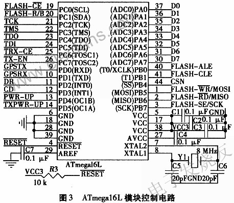 处理核心选用8位低功耗微控制器ATmegal6L,具有片内16 K字节的程序存储器,1 K字节的数据存储器和512字节的E2PROM。它具有32个通用I/O口线、32个通用工作寄存器、实时时钟RTC、1个USART、8通道10位ADC、具有片内振荡器的可编程看门狗定时器、SPI串行端口、与IEEE1149.1规范兼容的JTAG测试接口,此接口同时还可以用于片上调试,以及六种可以通过软件选择的省电模式。其中使用了PD0(RXD)引脚接受Leadtek 9548GPS传送的GPS数据,并对数据进行处理,考虑到单片机内部的flash存储空间较小,可利用ATmegal6L的PA组口进行存储扩展,这里使用的是K9F3208并口数据存储芯片。可以通过两种方式向上位PC机传送数据,一是通过ATmegal6L的串口外接MAX232芯片,辅助外围电路,通过PC机的RS232通用串行接口传输,二是通过ATmegal6L的SPI接口外接NRF905无线收发模块向控制中心传输数据,这种传输功耗较大,只在出现突发情况的时候采用这种传输方式。ATmegal6L模块控制电路如图3。