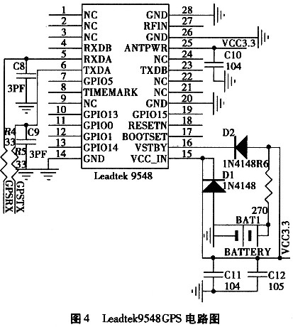 GPS卫星定位部分由Leadtek 9548GPS核心模块,辅助以外围电路组成。Leadtek 9548GPS模块核心采用美国瑟孚公司设计的SIRFStarIII低耗电量卫星定位接收晶片,有20个通道,能够确保最高的接收灵敏度;内部有可充电电池,可以保存星历数据,便于快速定位;标准的MMCX天线接口,便于连接GPS天线;标准NMEA0183信号输出;工作电压低(3.3~5.0V直流),工作电流小(49 mA),接收灵敏度为-159 dBm;TTL电平数据输出,每秒一次GPS全数据;支持多种串口通讯波特率,标准设定为4800 bpsc。Leadtek9548GPS电路图如图4。