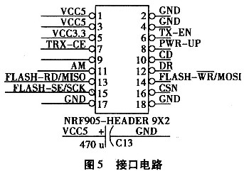 NRF905利用SPI接口与ATmegal6L进行通信,该模块提供了9×2标准DIP间距接口,方便我们与单片机的连接,接口电路如图5。