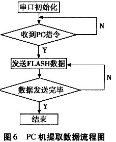 本设计中,巡更仪FLASH中存储的数据主要通过标准RS232串行通信口向PC机传送。PC机通过串口向巡更仪发送获取数据请求,巡更仪CPU检测到该请求后开始向PC机发送数据,流程图如图6。