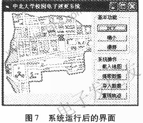 本设计实现了电子地图的制作与控制、巡更仪对巡更人员位置数据的提取与处理。系统运行后的界面如图7。