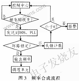 如果说基于“DDS+PLL”硬件实现方式是跳频信号源的“骨架”,那跳频信号源的“血肉”就是软件;只有在软件的配合下才有可能把跳频信号源的作用发挥到最大。软件系统采用模块化编程,包括主程序、系统控制模块、数据处理模块以及通信模块。以系统控制模块中频率合成流程图为例简要说明软件流程,如图3所示。