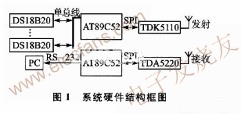 随着科学技术的发展,简单、方便、实用的东西越来越受到人们的喜爱。无线通信技术的发展为人们的生活、生产带来了极大的改变,节省了大量的人力、物力资源。现在,无线通信技术已经应用到生活的方方面面。在一些不利于有线通信的场所,无线通信技术更是起到了不可替代的作用。小到对讲机,大到移动通信网络,它们无疑在改变着人们的生活方式。比如在生产环境恶劣的生产车间,工作人员不能长时间停留在现场观察设备是否运行正常,就需要将采集到的数据传输到一个环境相对好的控制室内,工作人员可以在这里观察整个生产线的一举一动。由于厂房大、监测点多等原因,需要传输的数据多,使用传统的有线数据传输方式就需要铺设很多很长的线缆,浪费资源,占用空间,可操作性差,出现错误时换线困难。显然,采用有线数据传输弊端很多,因此采用无线数据传输方式可大大改观有线方式的不足。又如在冷库等不利于工作人员天天进出的场所,采用无线数据发射方式可以避免进出困难,同时无线发射装置的移植性好,可随时安装或拆除。基于以上考虑,本文设计探讨了基于TDK5110与TDA5220的无线温度采集系统。