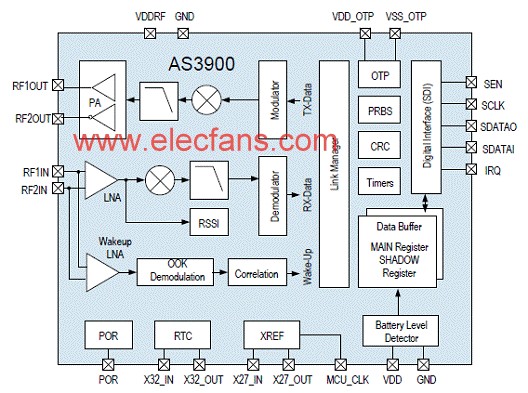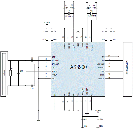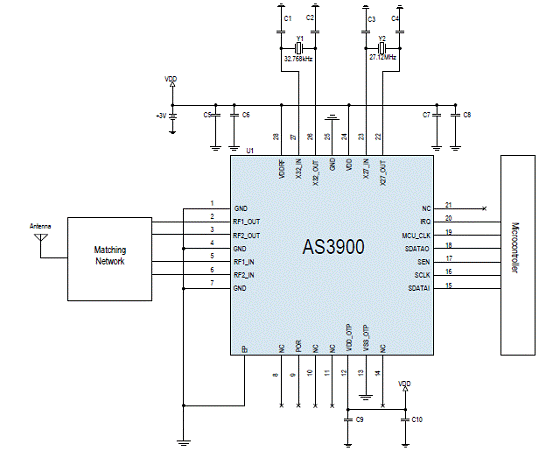 图2.低功耗星形网络收发器AS3900典型应用框图
