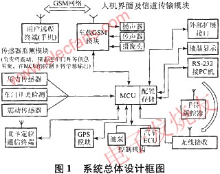 数据采集模块中可供利用的有多种传感器,如振动传感器、压力传感器、开关式和断线式传感器等多种类型的传感器,当汽车受到振动、车门被打开或者有人坐在座位上时就会产生不同的信息,将这些传感器收集到的不同数据和信息输入系统MCU,以供后续处理。此模块设计思路是充分利用车载已有的安全成熟的产品作为系统部分。其优点是:系统安全性和稳定性将大幅提高;可以较好地解决系统状态控制问题,若仅考虑利用手机短信进行设防和解防,不仅很不方便,而且长期的额外信息费用也是不可忽视的;可在原有基础上进行改装,降低产品的成本,同时还可以合理有效地利用已有车载设备,使资源得到合理有效的配置。