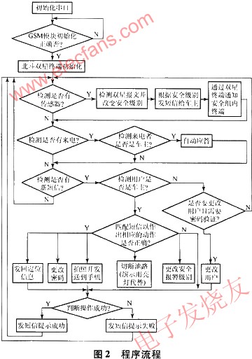 本系统软件主要参照欧洲电信联盟的GSM0707、GSM0705、GSM0338等规范和协议,结合标准的AT指令集设计编辑而成,并且通过RS -232串口收发来实现MCU与GSM模块、CPS模块和北斗双星导航定位终端的双向通信。经过大量试验,该软件在系统上运行稳定,其通用性和移植性都很好。系统软件设计流程图见图2。