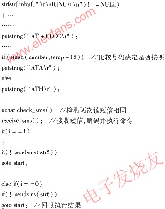 二是检测是否有新短信或来电,有则读回并解码执行用户通过短信发来的命令或核实用户来电后控制GSM模块自动应答。由于从串口读取大量数据时不免存在误码,为防止执行错误命令,MCU将连续重复读取同一条短信两次,两次相同时才执行短信中的命令,否则重新读此短信。