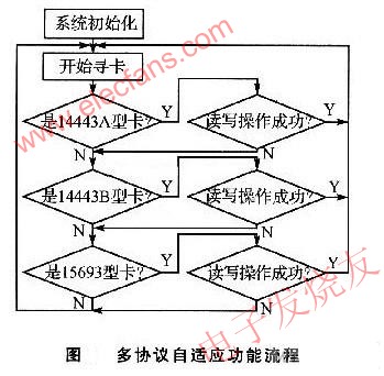 打通了底层通信的关键环节之后,就可以一步一步地编写调试各个软件模块。图3是读卡器多协议自适应功能软件模块流程。