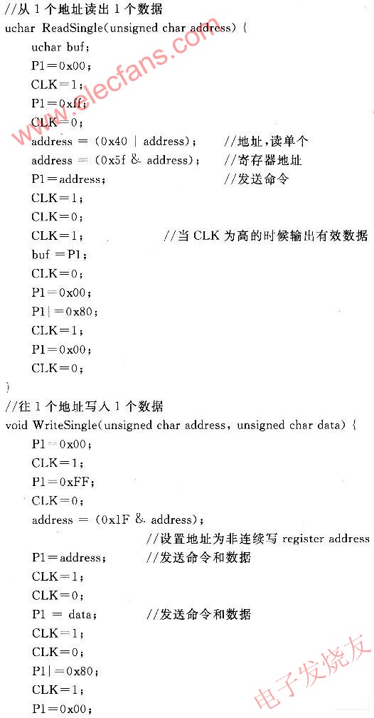 起始条件是CLK为高,然后先发送8位地址,再发送数据。发送格式在时钟的下降沿进行发送,当CLK为高时,在A/D有1个下降沿,表示结束。根据该时序图可以写出STCllF32XE单片机从TRF7960读/写1个字节的C语言实现代码: