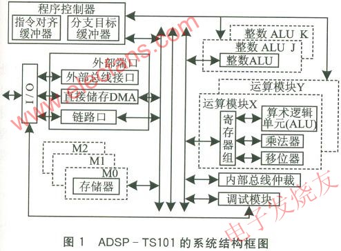 图1为ADSP一TSl01的系统结构框图。由图可见,Adsp-TS101包括PEX、PEY两个运算单元,每一个浮点运算有一个算术逻辑单元、乘法器、移位器、32字寄存器组。另外,算术逻辑单元、乘法器、移位器为并行排列,可进行单周期多功能操作,如在同一机器周期中算术逻辑单元和乘法器可同时进行操作。