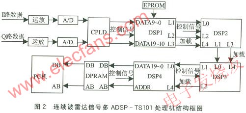 ③ DSP1。DSP1主要完成:A/D数据输入变换,并输出到DSP2;系统自举。系统采用EPROM自举方式,4个DSP的加载任务由DSP1完成。初始化时,DSP1通过链路口1发出一个控制字,将工作参数传给DSP2、DSP3、DSP4。链路口3和链路口4用于系统自举。