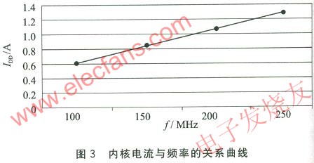 内核最大电流为1.277 A。该电流是DSP进行单指令流多数据流(SIMD)方式下,4个16位定点字乘加与2个四字读取并行操作以及进行由外部口到内部存储器DMA操作所需的电流。实际上,DSP内核电流大小还和内核工作频率有关,图3所示是其内核电流与频率的关系曲线。因此,供给DSP内核电流可根据不同的并行处理任务和内核工作频率来确定。若并行处理较少,工作频率低,所需电流就小。这样,最大内核功耗为PDD=VDD×IDD=1.2 V×1.277 A="1".534 W。
