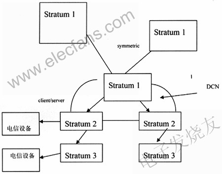 Stratum 1时间服务器取得GPS时间信号和其他授时方式时间信号,比如其他导航卫星,短波,长波方式,互为备用。上下级Stratum采用DCN相连或专线相连,保持稳定相连。各级时间服务器把时间信号发到各个通信设备,如图3所示。