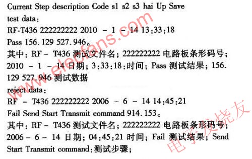 其中:RF-T436测试文件名;222222222电路板条形码号;2006-6-14日期;04:45:21时间;Fail测试结果;Send Start Transmit command:测试步骤;