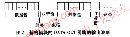AT88RF256卡在默认状态下读卡片用MILLLER(密勒)码,写命令数据用MANCHESTER(曼彻斯特)码。初始化下,密勒码元宽度是128μ8,曼彻斯*元宽度是256μs。读写器要对卡片发送命令,除了卡片要进入射频场内获取能量外,发送时间也受限制。卡片进入射频场后,按如下格式向读写卡器循环发送数据:起始位;32~152位 (长度可自行设定)的ID数据;停止位;8位收听窗(Listening Window)。图2示出基站模块的DATA OUT引脚的输出波形,在每个数据包之间都有一个持续8位密勒码元宽度的低电平状态的收听窗。只有在收听窗第2位至第7位,射频才可以接收读写卡器发送的读、写命令。所以本设计的一个关键是如何捕捉到收听窗,这属于读卡和解码操作的一部分,解码是建立在对基站模块DATA OUT引脚波形分析的基础上。