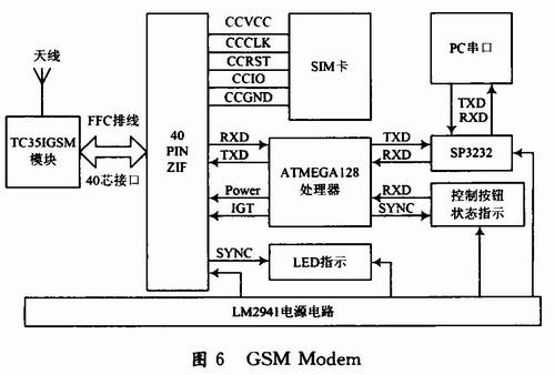 在TC35i应用过程中通常要结合微处理器或通过电平转换直接与PC串口通信。因此给出一个由TC35i与AVR微处理器构成的GSM Modem实例。该GSM Modem已经使用于GPS汽车防盗系统中。