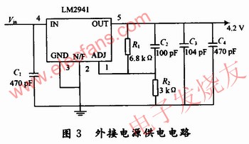 在实际应用中一般有2种供电方案,一种是采用外接电源供电,需将电源电压转换为模块所需电压(推荐4.2 V)。可选用LM2941CS,它是开关型可调高性能微波电路专用稳压芯片,通过外围两个电阻的分压比能灵活改变输出电压,通过控制引脚可开启/关闭电源模块,如图3所示;另一种是采用普通手机电池供电,电池电压一般在3.6~4.O V,可选用LM2577电源芯片。LM2577可将电池电压(3.6~4.0 V)稳定在4.2 V左右,同时能输出最大电流3 A,以保证峰值时的电流消耗,如图4所示。