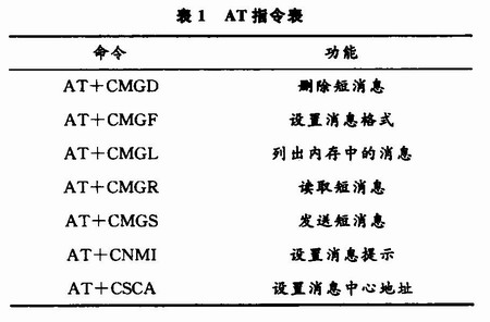 TC35IGSM模块提供的命令接口符合GSM07.05和GSM07.07规范。GSM07.07中定义的AT Command接口,提供了一种移动平台与数据终端设备之间的通用接口。在短消息模块收到网络发来的短消息时,能够通过串口向数据终端设备发送指示消息,数据终端设备可以使用GSM.AT指令通过串口向GSM模块发送各种命令。通过AT指令(见表1),可以控制SMS消息的接收与发送。