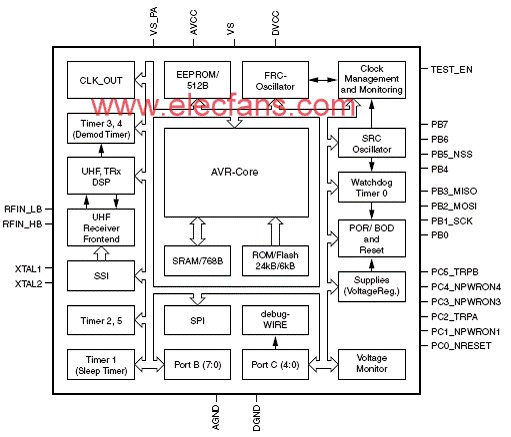 ATA5830是通用高度集成低功耗UHF ASK/FSK RF单片收发器,包括了RF部分,数字基带和AVR 微控制器内核,内核是采用增强RISC架构的低功耗CMOS 8位MCU.收发器工作在ISM频段,频率范围为310MHz- 318MHz, 418MHz-477MHz以及 836MHz - 928MHz,数据速率0.5k到20kBit/s Manchester,工作电压1.9V-3.6V和4.5V-5.5V,工作温度–40℃到+105℃,主要用在RKE,TPMS,遥控起动和控制系统,以及智能RF应用.