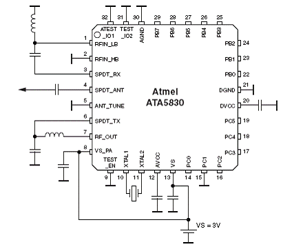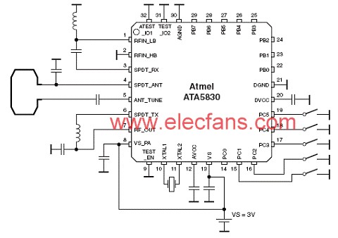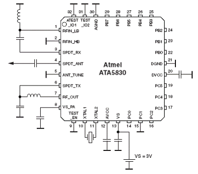 图5.ATA5830采用回路天线的典型3V应用电路图