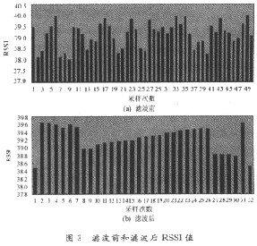 如图3所示,滤波前RSSI波动比较大,滤波后比较平滑。滤波前|RSSI|的平均值为38.9,计算距离d=O.71 m;滤波后|RSSI|的平均值为39.42,计算距离d=O.81 m。显然,高斯滤波能很好地提高测距精度。
