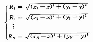 假设无线定位网络中有N个已知位置的参考节点,坐标为(x1,y1),(x2,y2),…,(xN,yN),RSSI测量值为(RSSI1,RSSI2,…,RSSIN)。通过利用无线信号传播衰落模型计算得到待定位节点到四个已知位置的参考节点的距离为R1,R2,…,RN,则可以得到以下方程: