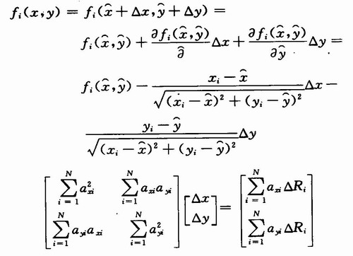 最终定位算法的研究就是求解该方程。在求解(x,y)过程中,选用基于泰勒级数展开迭代法进行计算。选用泰勒级数的原因基于以下几个方面: