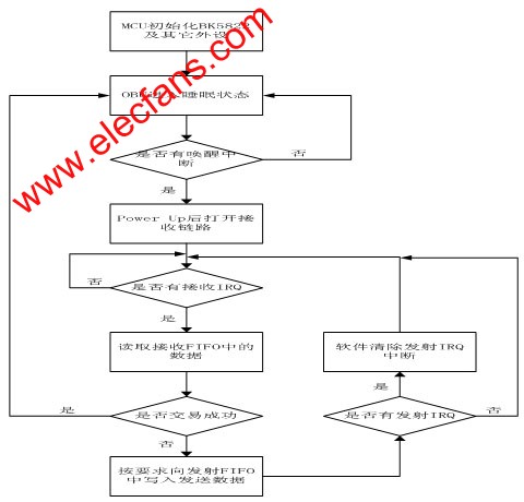 实际应用BK5822实现的OBU,在程序初始化后,一般来说,只是通过两个中断信号触发MCU之后,才与BK5822进行数据传输。一个中断信号为唤醒中断,另一个为IRQ中断。IRQ的中断信号在接收到数据或发射完数据后产生。具体MCU和BK5822的交互流程图如图4所示。