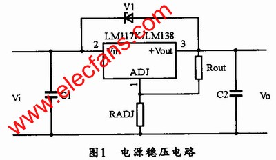 需要说明的是,图1中的稳压器管脚电压差Vo-Vi应在3-35 V范围内,超出范围将不稳压;LMll7K的额定电流为1.5 A,LMl38K的额定电流为5 A;这两个器件的两者管脚定义相同;为保证稳压器正常工作,设计时可选用0.25 W电阻ROUT,其值可选120Ω~240Ω。