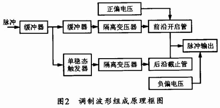 本调制器的组成原理框图如图2所示。图中,当定时脉冲输入到来时,经过缓冲器驱动后,该脉冲将分成两路,分别提供给调制脉冲前沿开启和后沿截止MOS管。其中前沿开启脉冲经缓冲器驱动和三极管放大后,加到隔离升压变压器,以保证高速开启管正常开启;而后沿截止脉冲则使用后沿触发的单稳态触发电路形成,以保证形成的调制脉冲的宽度与定时脉冲的宽度一致。