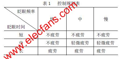 (2)模糊化与模糊推理规则的建立:模糊化是把精确的测量值经归一化转换到输入变量对应的论域中,再经由所定义的隶属度函数,将其转化为合适的模糊化语言变量,也就是隶属度以供模糊推理使用。在本文中,输入变量为眨眼时间和眨眼频率,我们采集的图像经过处理后得到眼睛睁闭的情况,并将眨眼频率转换为眨眼频率快、眨眼频率中、眨眼频率慢、眨眼时间长、眨眼时间中、眨眼短等模糊语言。因为我们对于眨眼频率以及眨眼时间各选用三种程度的模糊集合。因此,其相互间最多可得32=9 条控制规则,推理如下表1: