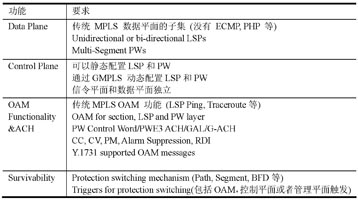 MPLS-TP 是IETF 和ITU-T 联合定义的以太网传输网络技术,MPLS-TP 基于MPLS 技术框架,针对传输网络特点做了一些优化,表1 列举了MPLS-TP的技术要求和传统MPLS的区别。