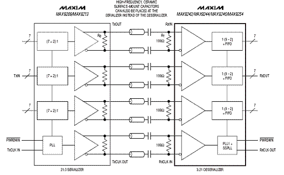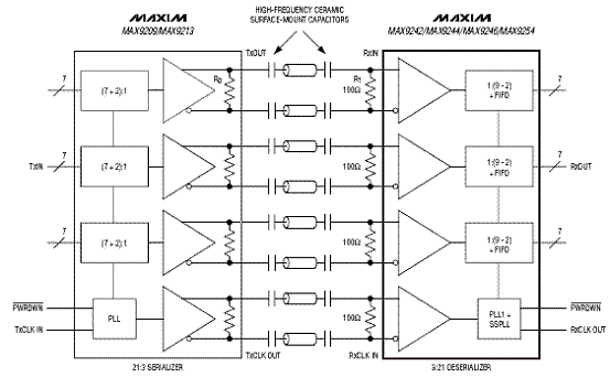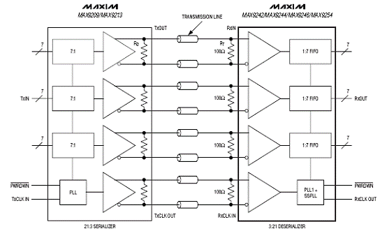 MAX9242/MAX9244/MAX9246/MAX9254能把三路LVDS串行数据输入转换成21路单端LVCMOS/ LVTTL输出.单端数据和