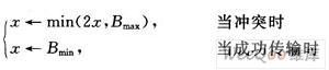 (1)由于每天有近三万辆车进出口岸,在出入境高峰期,口岸车辆拥堵,大量的并发数据可能使信道发生拥堵,从而使通讯系统瘫痪。为此,将每个基站分为8~16个信道,而每个信道即为基站和车载电子卡通讯的一个通道。使用跳频机制,即电子卡和基站进行配合通讯时,在不同的信道上进行快速跳转,选择合适的信道进行通讯,直至通讯成功。使用防碰撞机制,各个电子卡每次发送数据都要等到频道空间,如果遇到碰撞再用二进制指数退避算法随机延时一段时间,再次发送数据至成功。在算法中,每个节点发生冲突以后使其退避间隔双倍直到最大(Bmax),而当成功传输以后就使其退避间隔到最小(Bmin),公式表示如下: