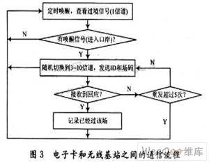 本系统依靠架设在口岸内部的无线基站作为读写器来采集进入口岸的车载电子卡信息,并且根据需要向指定的电子卡发送下行导引指令,通过车载卡语音导引车辆通关。每个口岸有惟一的一个唤醒基站,通过固定信道(频点)不断向整个口岸发送唤醒信号,电子卡接收到唤醒信号便进入工作状态,尝试通过固定信道接收基站发送的场定位信息,之后随机挑选空闲的信道不断发送自身的电子卡号和场码,直到收到基站的回应为止,基站将采集到的电子卡号发送给后台监控系统备份,以便下一步的出入境判决和导引信息的发送。图3以流程图的形式刻画了电子卡进入口岸之后与基站交互通讯的过程。
