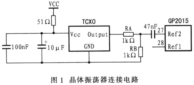 如图1所示,在电源和VCC端串接了一只51Ω的电阻器,并在VCC和GND之间并接了1对电容,其TCXO的电流消耗不能超过5mA,否则51Ω电阻器上的压降就会很大。