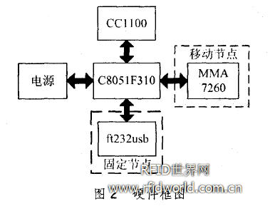 节点的硬件框图如图2。其中控制芯片和射频芯片分别选用Silicon C8051 F31 0 和ChipconCCI 1 O0。其中RFID 移动节点安装了FreescaleMMA726O加速度传感器,用来获取货车(或集装箱)当前的运动状态。移动节点还利用MCU 内部1 6KB大小的Flash储存货物信息。同时,RFID固定节点安装了FT232串口转USB芯片,用于和控制台通过USB接口通讯。电源方面,移动节点采用11 00mA手机电池供电,固定节点采用外接电源供电。