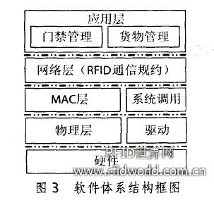 有了底层软件结构的支持,在最上层的软件体系结构对应的是OSI模型中应用层和网络层的功能,实现了门禁管理、货物管理等功能。这一层分为上下两层,下层对应网络层的职能,为RFID 读卡器和标签之间的通信设计了一套带低功耗算法的通信规约(见4。2节)。基于网络层的通信规约,门禁和货物管理这两大功能才能在应用层进行实现。