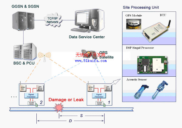 系统工作过程:在管线的相邻四个站点上各安装一只声压传感器,探头伸入到管道内部与管内流体相接触,当管路中部某处遭受破坏或发生泄漏时,破坏点的特征声波分别沿管线向两端传播至声压传感器,声波信号经预处理后,提取能表征此声波信号的特征参数;当特征参数与模式训练得到的模式特征相匹配时,立即启动同步时钟中断程序并记下特征声波到达的时刻,以便与特征声波信号到达另外站点的时刻比较,为破坏点位置计算做好准备;特征声波在流体中的传播速度和各站点的时钟同步精度决定着破坏点的定位精度,利用全球卫星定位系统(GPS)卫星的标准UTC时间,可提供TTL电平秒脉冲,通过时钟细分处理可以获得更加精确的秒内时间信息;贴有时间标签的特征声波信号经编码以后,以GPRS无线数据设备为数据终端单元(DTU),以移动分组数据业务GPRS网络为数据传输通道,并在此信道上提供TCP/IP连接,将测点的数据传送到数据服务中心。