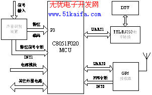 时钟细分的工作过程为: C8051F020采用中断方式接收GPS的UTC时间信息,每秒由GPS接收器的PPS产生INT0中断,响应中断后,在INT0 中断服务程序中,定时器先清零后启动,以便进行时钟细分,同时通过UART0接收GPS时间帧信息。当下一个PPS触发INT0时,同样定时器先清零后启动,存储时间数据结构更新。这样INT0中断周而复始,每秒中断一次;外部INT1由专用DSP芯片的P11端口触发,且被设为最高优先级,如果外部INT1中断被触发,表示声音识别单元已经将破坏声波识别成功,主程序立即转向INT1中断服务程序,读定时器的高字节和低字节寄存器的数据,CPU经过处理将时间信息与GPS时间帧合并制成时间标签。