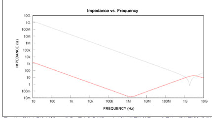 图1.放大器的电源线会拾取RF信号。图中数据表明1μF电容的对地阻抗低于10pF的阻抗,提供更好的噪音抑制能力