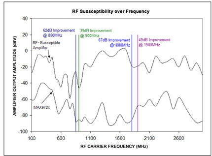 图2.数据表明:与普通放大器相比,MAX9724有效降低了放大器的RF敏感度