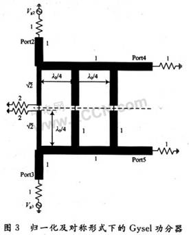 为简单起见,用端口1的特性阻抗Z0归一化所有阻抗。归一化及对称形式下的改进型Gysel功率分配/合成器如图3所示,在输出端口接电压源,当Vg2与Vg3等幅同相时,为偶模激励。此时,中心对称平面相当于一个磁壁(开路)。当Vg2与Vg3等幅反相时,为奇模激励。此时,中心对称平面相当于一个电壁(短路)。