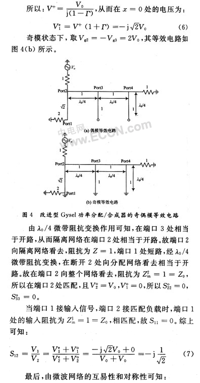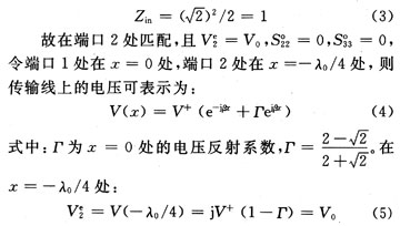 偶模状态下,取Vg2=Vg3=2V0,其等效电路如图4(a)所示。由λ0/4微带阻抗变换作用可知,在端口3处相当于短路,从而隔离网络在端口2处相当于开路。从端口2向端口1的阻抗为: