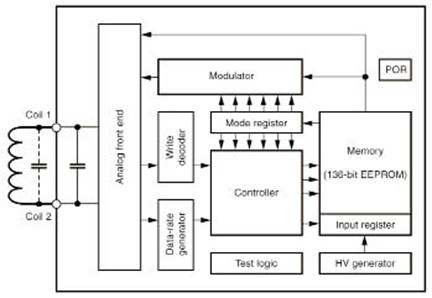 可以从一个基站(阅读器)以字节方式读取片上128位用户EEPROM(16字节,每个字节8位)。通过负载调制从IDIC(上行链路)发送数据,这是利用位于两端的线圈1和线圈2之间的阻性负载抑制RF场来实现的。IC接收并解码串行基站命令(下行链路),后者被编码作为100%幅度调制(OOK)脉冲间隔编码位流。