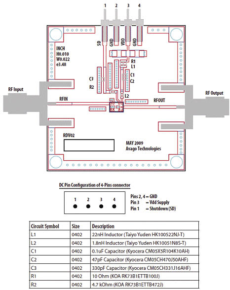 该模块在输入和输出RF引脚完全匹配。这些引脚同时还有内置耦合和DC模块化电容。利用高Q电感线圈可以实现最佳的噪声性能。该电路演示了利用标准的0402芯片电感可以获得低噪声性能。
