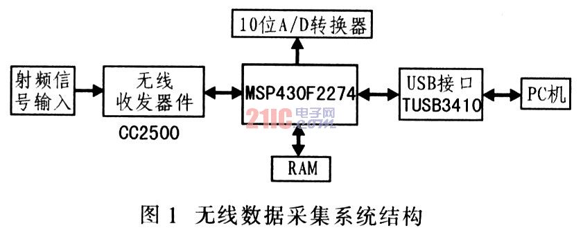 基于MSP430单片机和CC2500无线收发器的USB无线数据采集系统,主要由主控单元、CC2500无线收发器和USB接口电路构成,图1为系统方框图。该系统可以通过CC2500无线收发器接收外部无线射频信号,MSP430F2274控制数据的接收、处理、传输,将数据打包后通过USB接口传送至PC机,利用PC机上的开发平台处理和分析数据,并显示于系统界面。同时,也可以通过PC机将控制命令通过USB接口传送给MSP430控制器,实现对外围设备的控制。