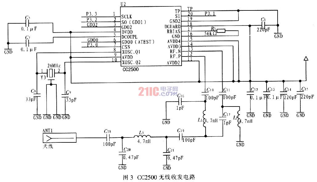CC2500无线收发电路如图3所示。采用低成本单芯片的2.4 GHz无线收发器CC2500。电路设定为2 400~2 483.5 MHz的ISM和SRD频率波段。该收发器内部集成了一个数据传输率达500 kb/s的高度可配置的调制解调器。可编程控制的输出功率可达+1 dBm,支持2-FSK和MSK。 CC2500用作一个低IF接收器。接收的RF信号通过低噪声放大器(LNA)放大,再对中间频率(IF)求积分向下转换。在IF下,I/Q信号通过A/D转换器被数字化。自动增益控制(AGC),细微频率滤波和解调位/数据包同步均数字化工作。CC2500的发送器部分基于RF频率的直接合成。频率合成器包含一个完整的芯片LCVCO和一个对接收模式下的向下转换混频器产生I和Q本振信号的90°相移装置。